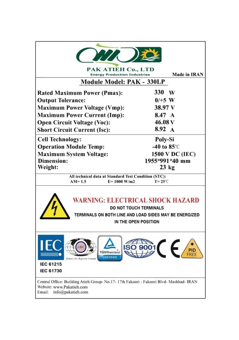 پنل خورشیدی 330 وات پلی کریستال ساخت شرکت پاک آتیه در ابعاد 1955*991*35 میلیمتر ساخته شده است.توان بیشینه این پنل در شرایط استاندارد حداکثر به مقدار 330 وات می رسد. وزن این پنل خورشیدی 23 کیلوگرم است و دارای گواهینامه ip68 می باشد.محدوده عملکرد دمایی این پنا از دمای -40 تا +85 درجه سانتی گراد است .از ویژگیهای متمایز این محصول می توان به استغاده از قابلیت مالتی باس بار در این پنل اشاره کرد .پنل خورشیدی 330 وات پاک آتیه دارای 5 عدد باس بار در هر سلول خود است.